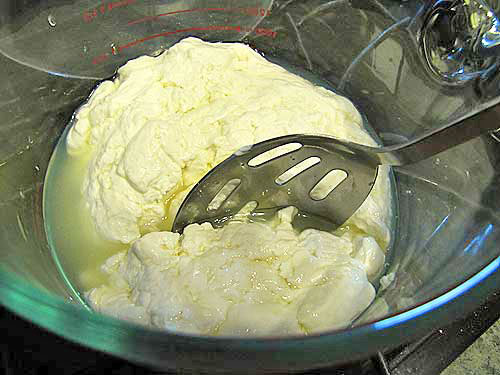 Step 6. Spoon the curd/cream mixture onto the stretched cheese bowl you’ve made.