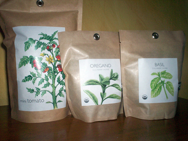 Now…the herbs. These are literally a Garden in a Bag, in fact, that’s what it says on the bag!!! This kit includes the bags for tomatoes, oregano and basil. For all of these fresh and tasty herbs and tomatoes, all you have to do is cut open the bag; take out the packets of soil and seed. Pour the soil into the Garden-in-a bag and level the soil. Sprinkle the seeds evenly over the soil and then lightly water seed into the soil. You then place a plastic bag over the top of the Garden-in-a bag and put it in a warm area out of direct sunlight until the seeds sprout.