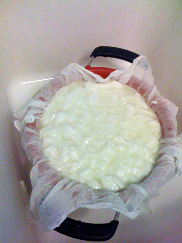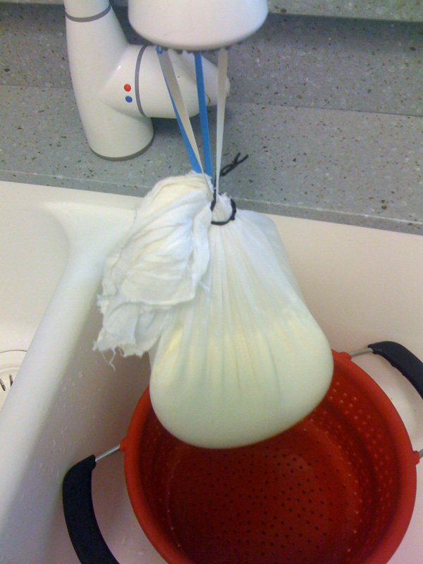 5. Tie up the corners and allow to drain for 6-12 hours, at room temperature (again, at least 72F). The longer it drains the drier it will be. Just check in on it every few hours. I use twist-ties and rubber bands and just hook it onto my kitchen faucet.
