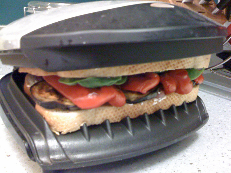 Panini with grilled veggies (eggplant, red bell peppers, and onions), spinach, fresh chèvre on Sourdough. Oh yeah!