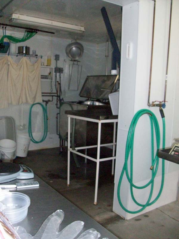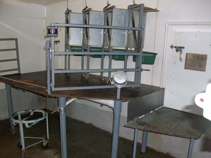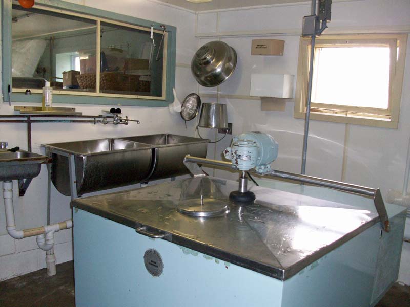This is where the goats are milked. The milk can sits on the rolling stand and then it is carried into the next room where it is filtered and pasteurized.
