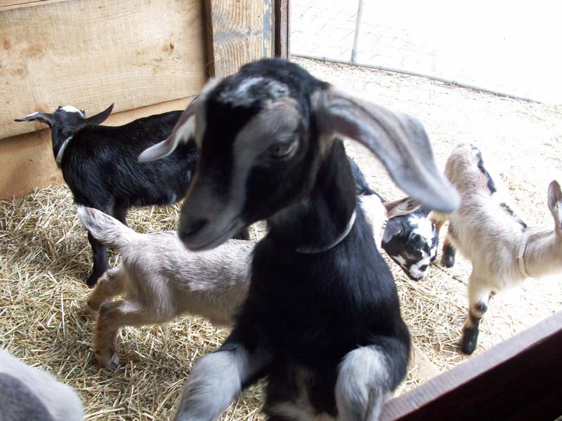 Ten years ago, they had 45 goats. Since then, they have downsized to keep their lives sane. Now, they manage a closed herd with 25 milkers. When the kids are born they are bottle fed and kept in a warm area of the barn. They virtually imprint to Carolyn and Joe. The result is the friendliest goats you will ever see. Carolyn milks the nannies twice a day. Each one yields around a gallon per day.