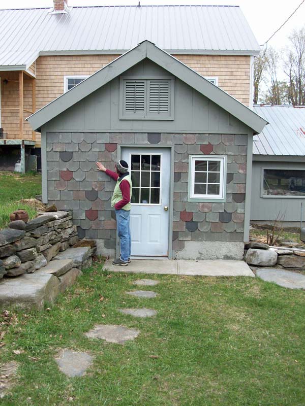 Carolyn shows the slate wall on the front of her aging “cave.”