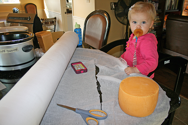 | Rashel’s assistant helping her cut cheesecloth for clothbound Cheddar. |