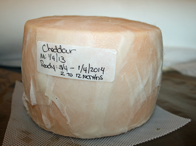 Bandaging is most often used with Cheddar because it results in a drier, flakier cheese. (If you love the “crunch” in a well aged Cheddar, this is the technique for you!) The flavor is also strongly enhanced by the bandage wrap, because the molds (on the outside of the cheese) eat the fat on the bandage (and not the cheese).