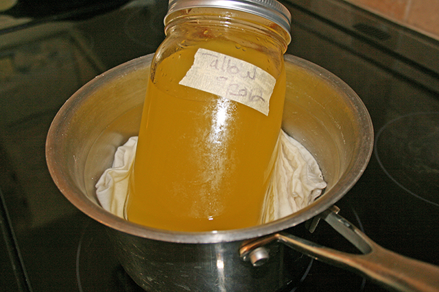 I store my fat in the freezer and take it out the night before I want to use it. Then I put that whole quart jar of solid fat in a pot of water with a fabric napkin underneath. Put the heat on LOW… let it warm until it’s completely liquified, it takes a while, don’t watch the pot.