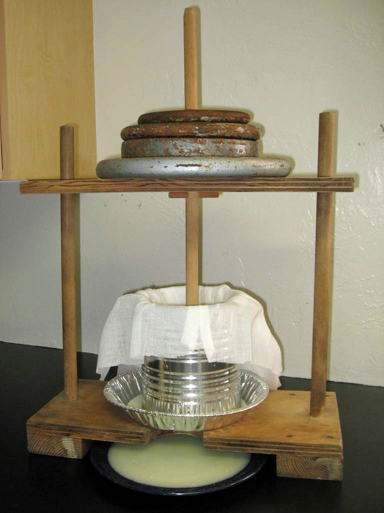 So I found the book buried in the cabinet and dusted it off. I made mozzarella first which resembled the texture of rubber bands as a result of substituting vitamin C for citric acid and having an inaccurate thermometer. I had my brothers build me a press with plywood and dowels, and early one morning I asked a worker in Wal-mart where to find barbells! (He eyed me a little curiously.)