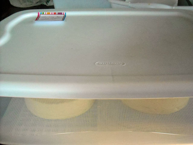 Finally, transfer the cheese to a tub with a lid making sure to sanitize the platforms and mats and put them into the covered tub before adding in the cheeses.