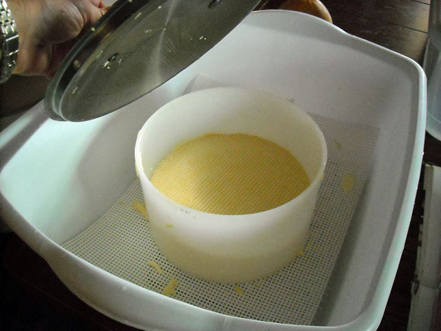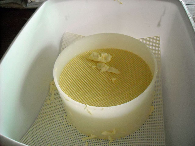 Return about 30 minutes later, very carefully drain the excess whey out of the bottom of the tubs (just lift the platform and all on top out, dump out the whey and then return the mould as it was), and then fill the moulds with more cheese curds. You may need to repeat this step one more time, but just repeat what you did above until all of the curds are equally distributed between the two moulds.