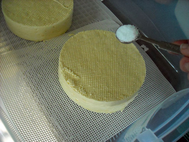 Sprinkle each side of each cheese with 1 tsp of salt and then store the covered tub at 55 degrees for 10 days, flipping the cheese one a day and wiping out the tub each day with a paper towel to remove all excess moisture and drained liquid.