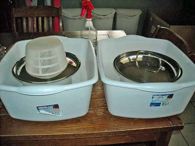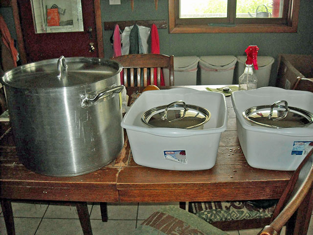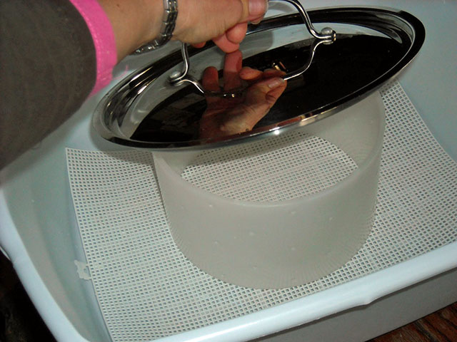While the milk is setting, take this time to sterilize the draining and mould set up for the cheeses. I have found that this set up works best for me. A draining platform set into the bottom of a plastic wash tub with a draining mat on top, an open ended Brie mould on top of that, and a pot lid to top it all off.