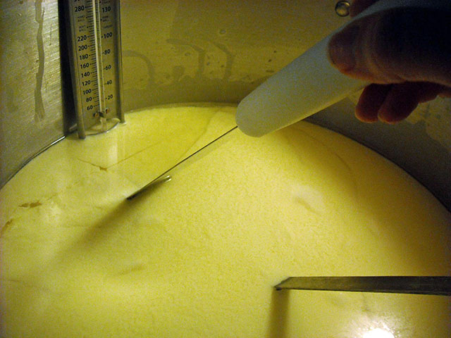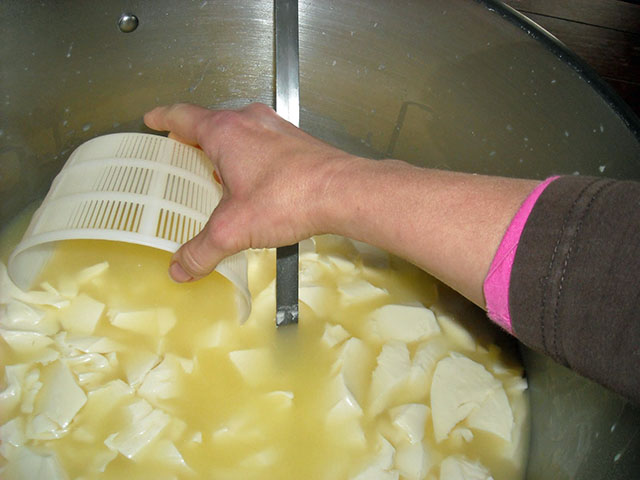 Now, remove as much of the whey off the top as you can without disturbing the curds.