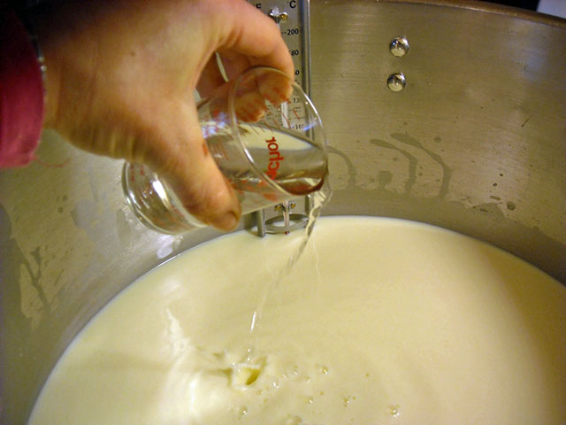 Next mix 1/2 teaspoon of liquid rennet with 1/2 cup cool water, pour the mixture into the cultured milk and again stir up and down with 20 more strokes.