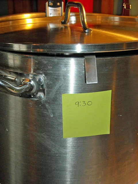 Now, cover the pot and allow to sit for 1 hour and 30 minutes (as you can see, I put a post-it note on to remind me when I needed to tend to it next).
