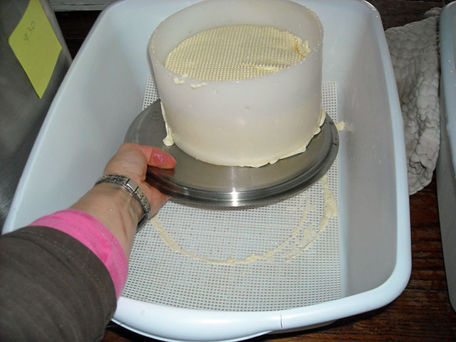 Slide the cheese back onto the mat in the drained tub…repeat with other cheese