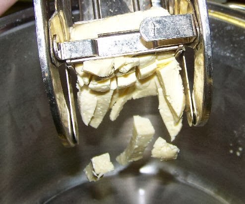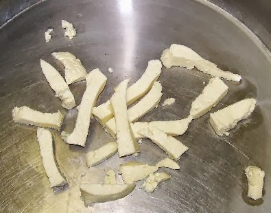 There are 2 ways to do this next step. You can use a knife or you can use a french fry mill/cutter. Put the curds through the mill or cut into strips about that size.