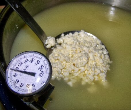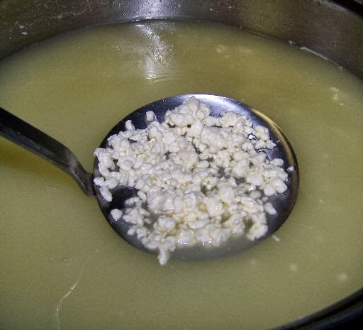It is time to test and see if the curds are ready to be drained. Pull some up from the bottom in the flat cheese ladle. Take a small handful and gently squeeze. If they hold together then they are ready. They should also easily separate back out.