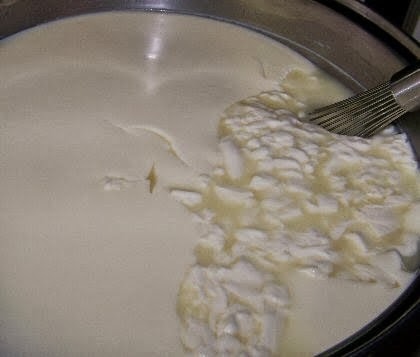 You will need to stir the curds gently and often. I stirred with the whisk. Once the temperature hits 90° F and above, then the curds will try to mat together. You will need to be diligent in your stirring from that point on. Once you reach 100° F turn off the heat and watch that it does not get any hotter. If it does, remove it from the double boiler and set on the counter. It is good if you can keep them in the pot though because it helps keep the temperature constant. You are going to let the curds sit for 30 mins. undisturbed. They will sink to the bottom and mat together.