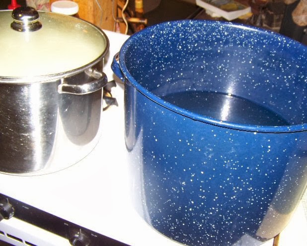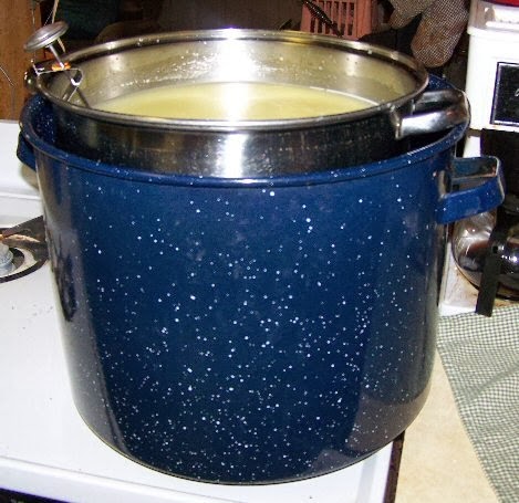 First of all fill your cheese pot with water. Put all your utensils that you will use in it and bring to a boil. This will sanitize all of your equipment and not cause problems with the cheese. Pour the boiling water into a larger stock pot or water bath canner. This will be used to heat the cheese and keep the temperature.