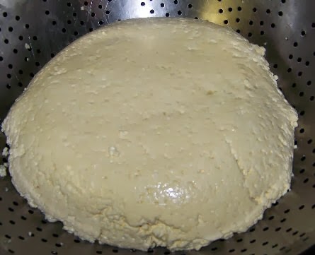 Put them back into the pan or into a bowl and add 2 1/2 tsp. of salt. Mix it in well with your hands. At this point, you can eat these as fresh cheese curds (they are really good) or you can press them into a wheel.