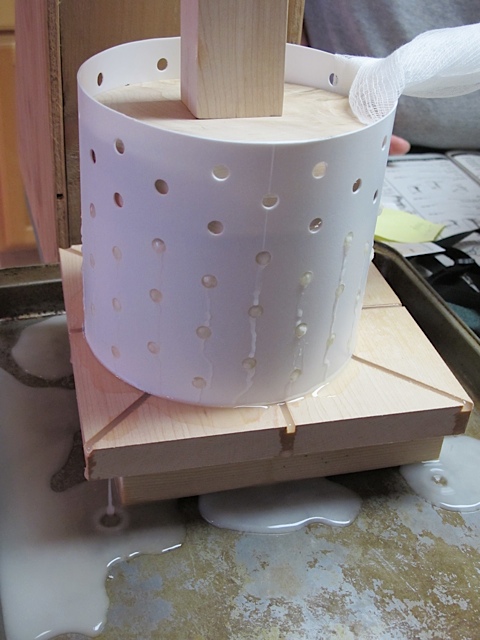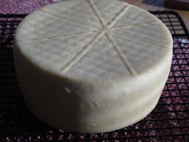 and finally 50 pounds for 12 hours. Between each pressing the cheese was removed from the mold, the cheesecloth was peeled away and then re-wrapped. With each pressing you could see that the cheese was getting more compact. After the final press the cheese was removed from the mold, the cheesecloth was peeled away and it was allowed to air dry at room temperature for several days.
