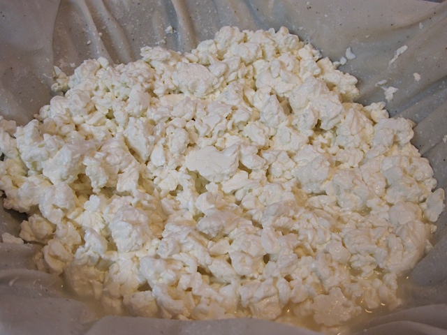 Once drained, the curds were broken into smaller pieces, salt was added and the curds were placed into a cheesecloth-lined mold.