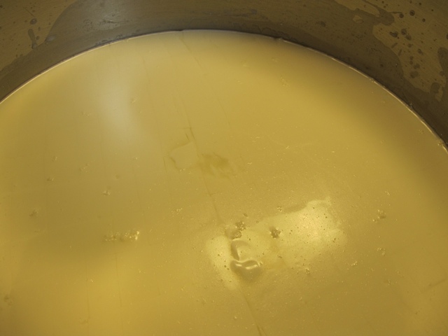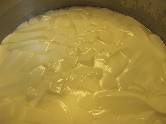 First the milk was heated to 86 degrees and the starter was added. The milk was covered and allowed to sit for an hour. Making sure the milk’s temperature was 86 degrees the rennet was added, stirred for several minutes and then allowed to sit for another 30 minutes or until the curd gave a clean break.