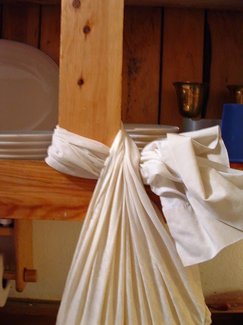 Next you’ll have to hang the pillowcase to drain for about twelve hours (overnight in my case). This is how I hook the pillowcase around my cabinet center. Obviously you’ll have to come up with whatever method works in your kitchen.