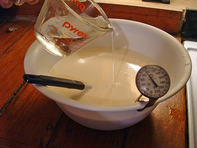 Once the water has reached 170F, start adding it to your bowl of cheese. You’ll need to add enough hot water to raise the temp of the cheese to 125F. This is why you’ll need the largestbowl you have. By the time I was done and the temp was correct, this white bowl was full to the brim. It looks like nothing more than a watery mess at this stage, but don’t worry.