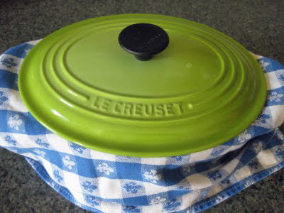Special equipment – a non-reactive, heavy bottomed pot with a lid (I used my 2-quart Le Creuset pot); a thermometer; a piece of butter-muslin* or cheese-cloth for draining the curds; a slotted spoon; a tea towel
