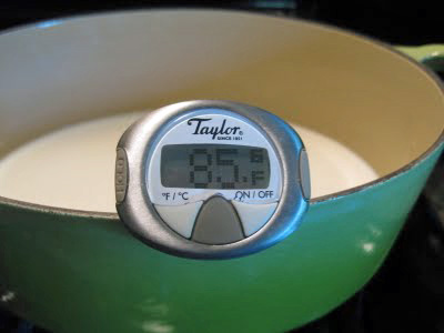Heat the milk to 85 degrees over a very low flame. (Keep an eye on both pot and thermometer — the milk will reach the proper temperature in only a minute or two.) Remove from heat.