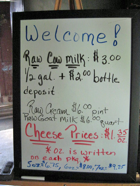 The self-help farm store may have goat’s milk cream, raw goat’s milk, raw cow’s milk, rabbit meat, grass fed beef and goat’s meat, and various cheeses including Feta and Robiola. (Your best bet is to call first to be sure they have what you need.)