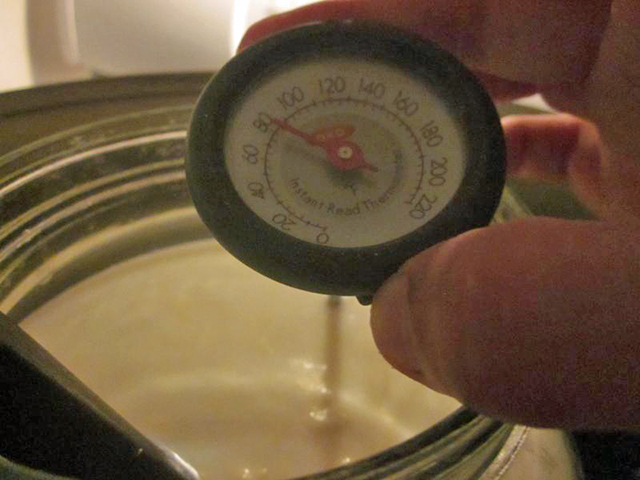 When the milk reached 86F, I turned off the flame and pulled it out of the water bath to stop it from getting any warmer. (Since the water was 100F, it would have kept heating up even with the stove turned off.) Then you add the cultures.