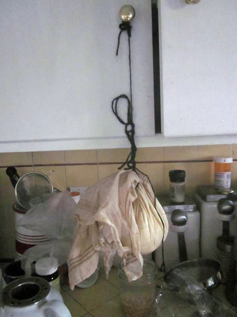 Next step, pull up the four corners of the cloth and tie it up so that is hanging over a container or the sink. You let it continue draining for 10-20 hrs. At the end, I began trying to get my cats to drink the whey (they weren’t that interested) and just tossing it into the “greywater” bucket I keep in my kitchen. You can’t give straight whey to your plants, but you can give it to them watered down – and I will. I know I’m being a bit wasteful, but honestly, I’ve got 4 pint jars of whey already and it’ll already be a project to figure out what to do with all of that.