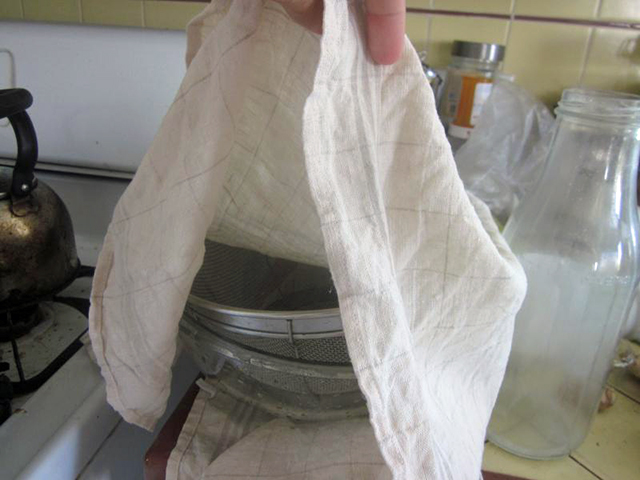 At this point, you need a bowl or pot, a colander, and several layers of cheesecloth or something with a bit finer weave than your average cheesecloth. I used an organic cotton tea towel. Place the colander in the bowl. Place the cheesecloth in the colander.