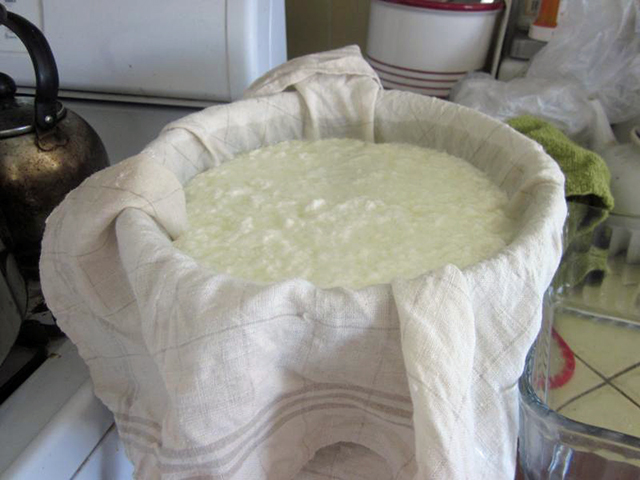 | The curds and whey in the cloth, with the whey draining into the bowl beneath. |