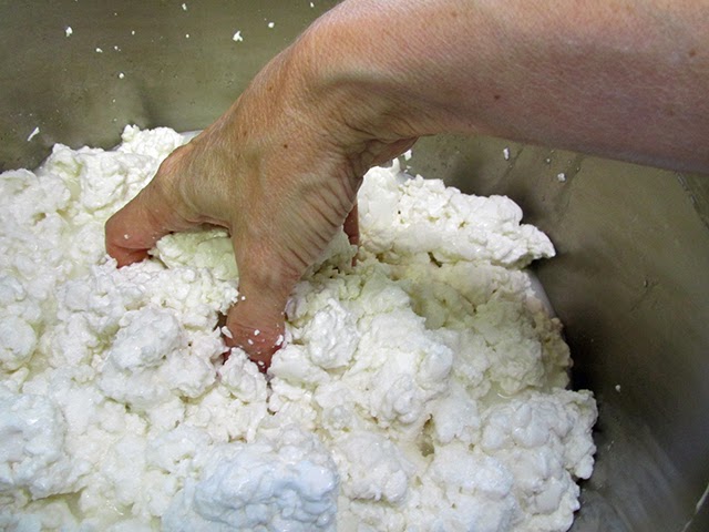 Drain off the whey and add all 2 tablespoons of the salt to the curds and mix well.