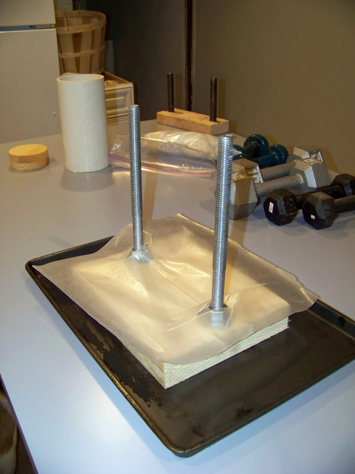 As promised from my last post, Goat’s Milk Cheddar, Our First Hard Cheese, here are some of the photos from our “weight system”, The Leaning Tower of …wait for it…Cheeza! Ha! (Please don’t unsubscribe, I’ll try to stop…but it’s a problem I have, over use of “cheesy” puns…oh no…I did it again…)