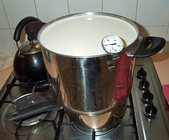 Sterilize all equipment. I put a quart (litre) of water into the pot, put all utensils in it, cover and boil for 15 minutes. Anything that may melt, I wipe down with vinegar and a boiled cloth. If I handle the milk/curds or finished cheese, I spray vinegar on my hands from a spray bottle and rub together until dry. That way the milk will not get infected by any wild yeasts or molds that are maybe on my hands.