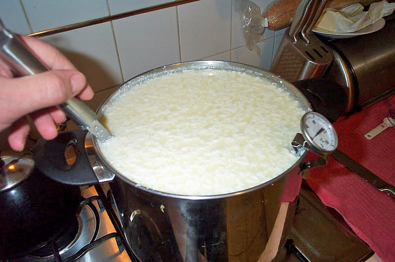 Stir the curds and whey for 10 minutes, then let rest for 15 minutes. Stir the curd again as you raise the temperature to 90F (32C). Maintain this temperature, and stir the curd as often as necessary to stop the curd knitting together. Do this for 2 hours.