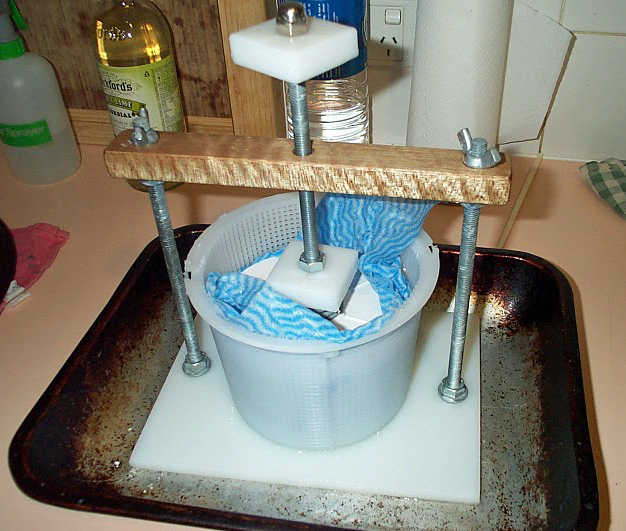 Fill with remainder of curd and press at 10 pounds (5kg) for 15 minutes. Carefully remove cheese from cloth, turn over and press at 50 pounds (25kg) for 12 hours.