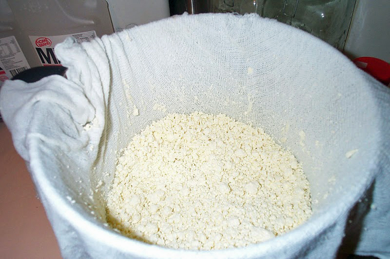 Drain the whey off and ladle the curd into a colander lined with cheesecloth. Tie in a bundle and for 2 hours, open every 15 minutes to break the curd into small pieces.
