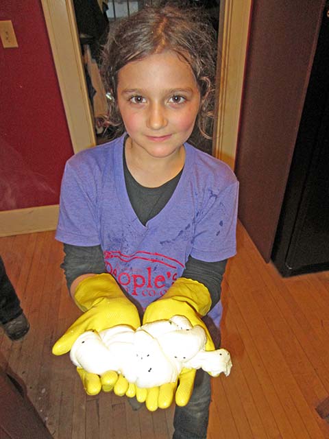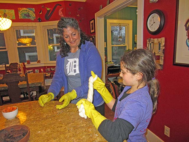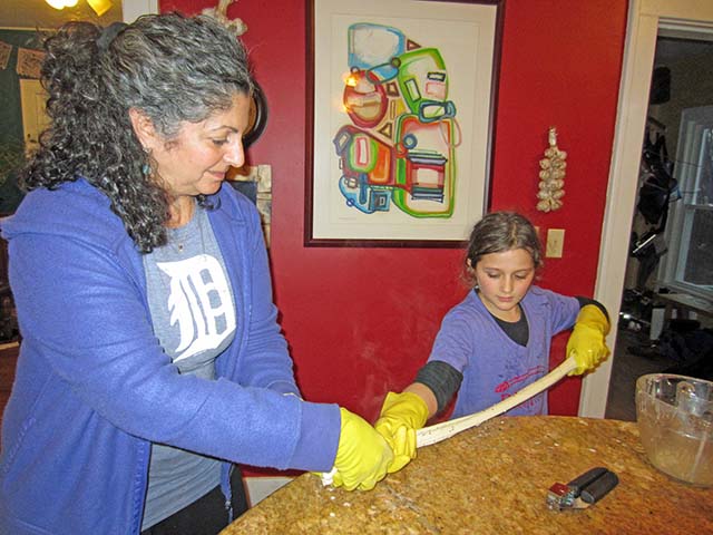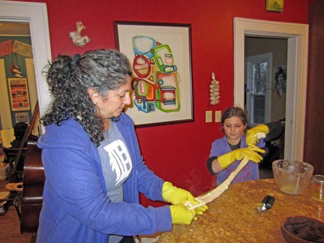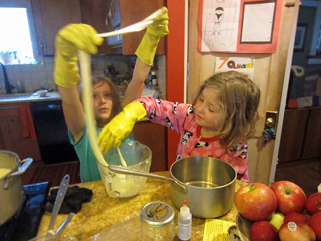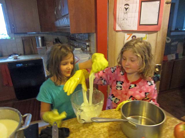 I love to make cheese with kids – I’ve attached a couple of pictures of Haniya stretching the cheese with her friend Kalee Henderson: