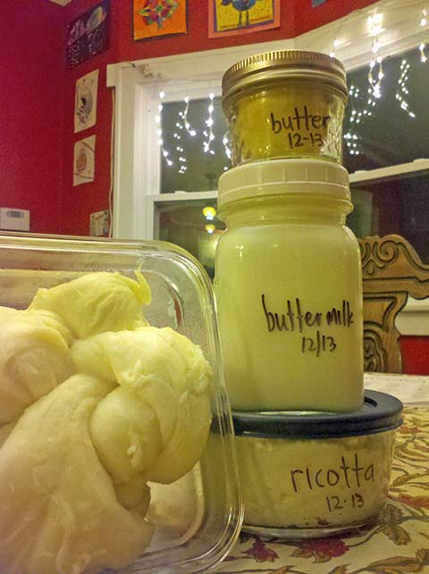 They have a raw milk share, so Hether is able to make whey Ricotta from the 30 minute recipe, which seldom works with pasteurized milk. She has also made Schiz, butter and buttermilk: