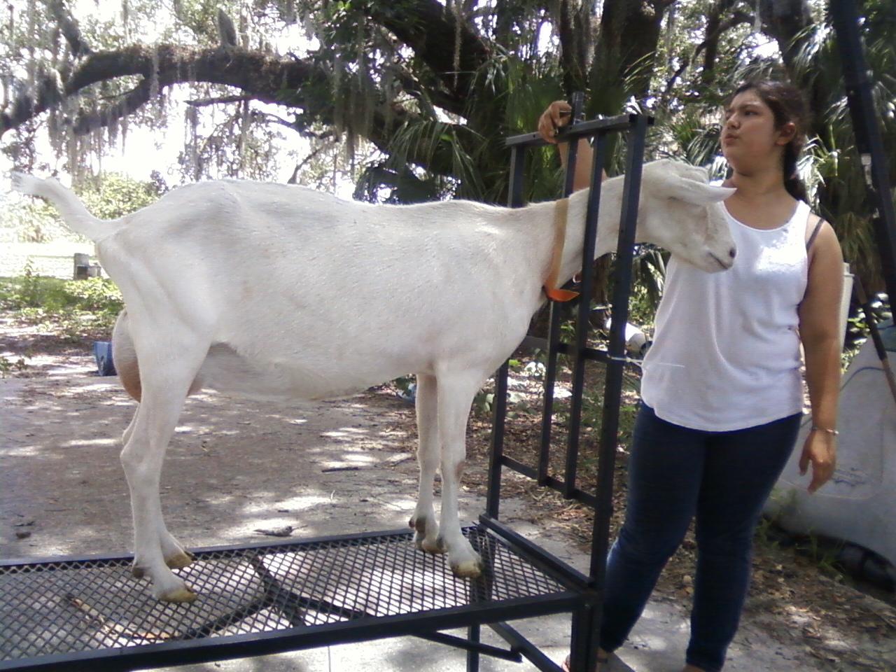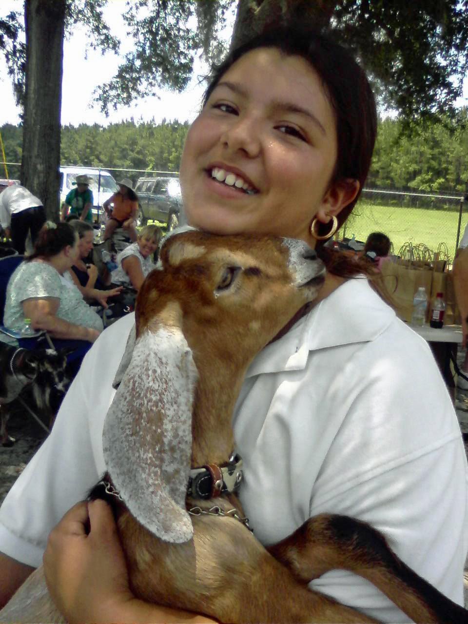 The small white goat is Harvest and she has won in 4-H Youth Shows at several big county fairs and at the State Fair in Tampa. I won Best of Breed with her and 2nd in Junior Showmanship.