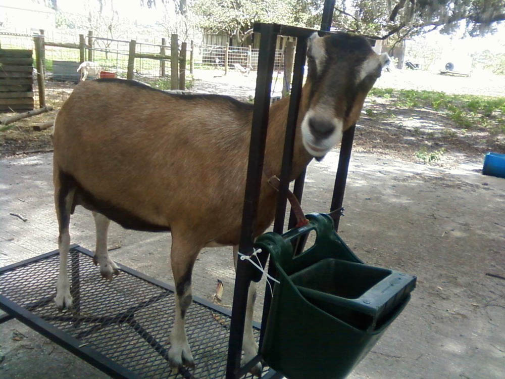 The big white doe with the nice big udder is All-that-Jazz. The creamy, frothy milk that we get from her smells and tastes like melted vanilla ice-cream! She is our sweetest girl and dressed up for the occasion to look her best, even putting on a little lipstick. lol. Actually, we give them treats on the goat-stand and she likes cranberry apple juice!