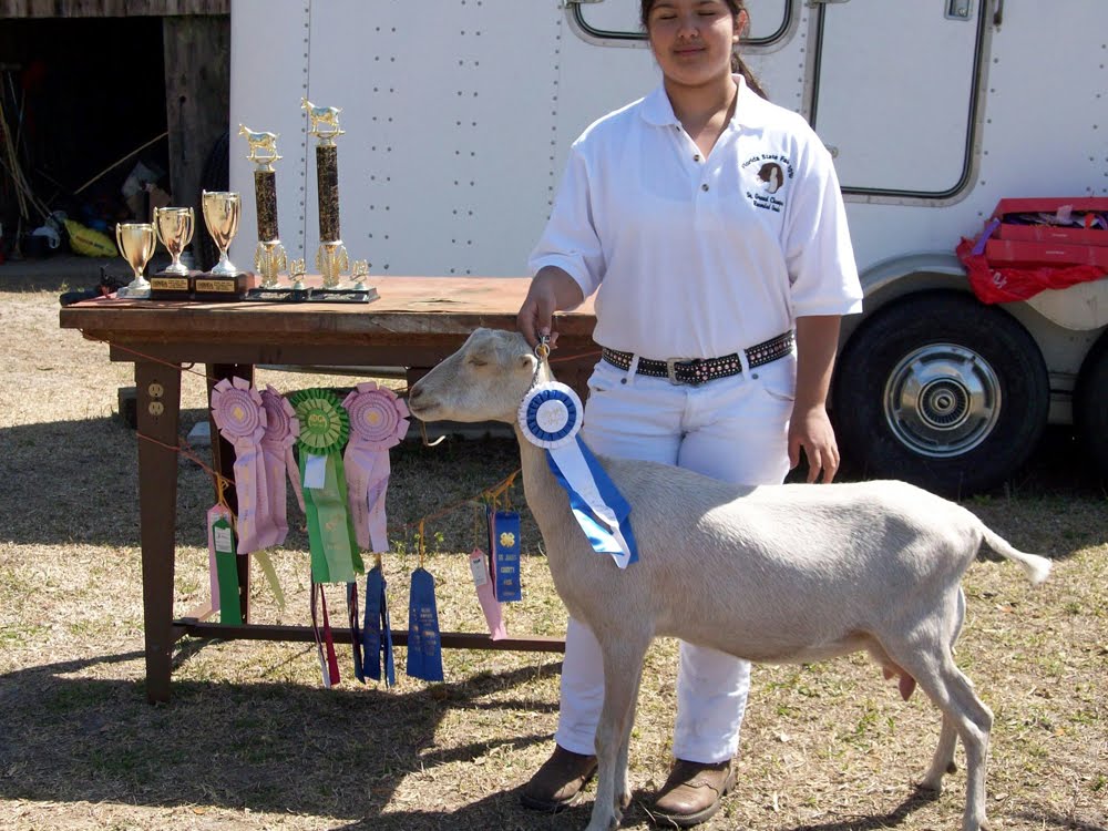The small white goat is Harvest and she has won in 4-H Youth Shows at several big county fairs and at the State Fair in Tampa. I won Best of Breed with her and 2nd in Junior Showmanship.