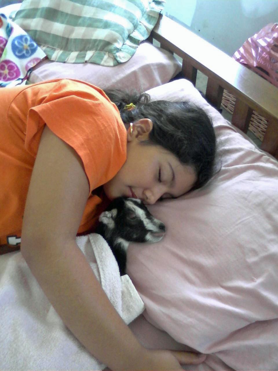 Here is a picture of me with our little preemie doe. She loves to snuggle in bed with me (don’t tell mom!).