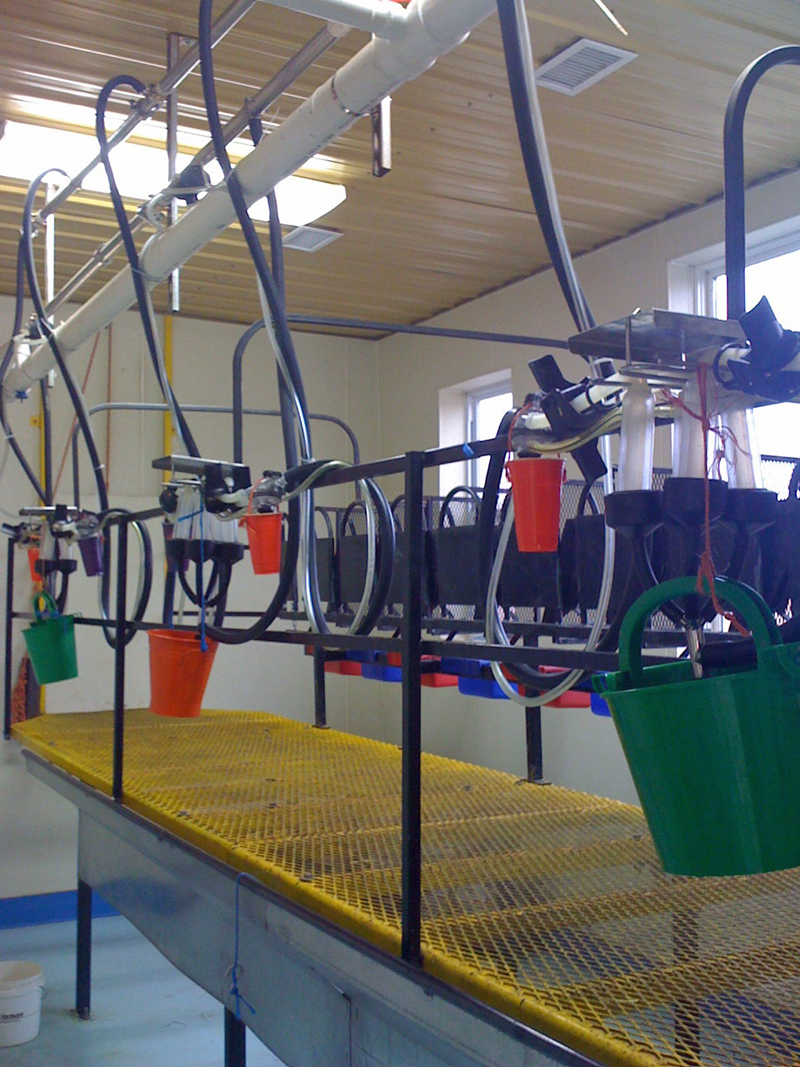 The goats are milked in the milking parlor that takes up one end of the barn, with the milk passing through the wall to the bulk tank in the cheese make room.
