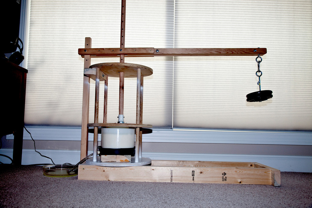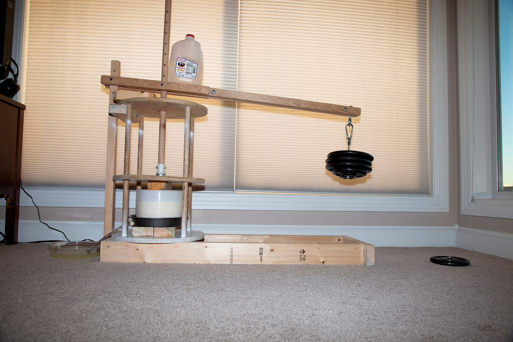 I made my own press. I researched on the internet and had my own ideas (naïve as they were) about what would work. Went to Lowes and bought material and put it together. The press was a direct weight press. I just added weight to the stem, which pressed the cheese. It actually worked pretty well. Although, if doing it again some things would change.
